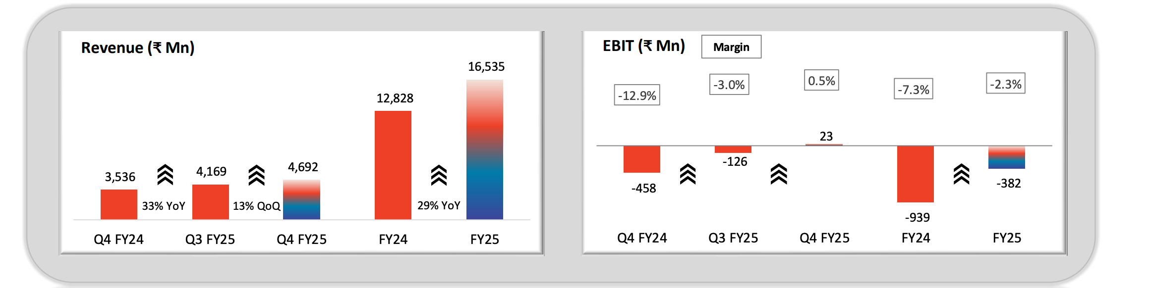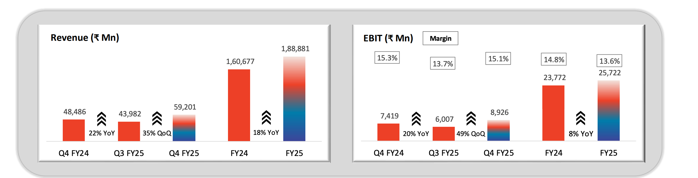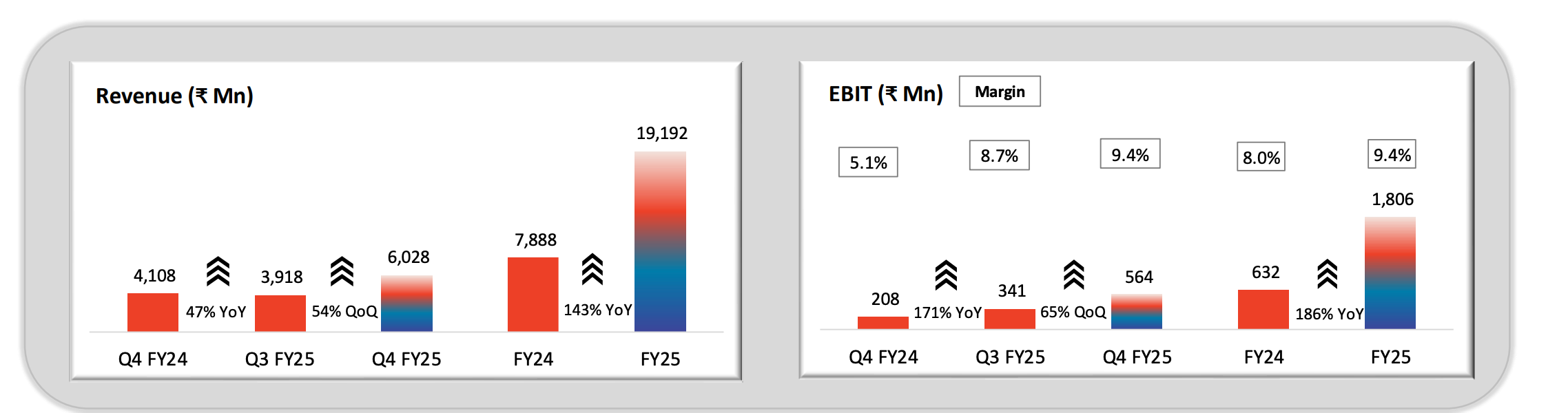 On the profitability front, EBIT rose by 171% YoY in Q4, with the EBIT margin improving to 9.4%. For FY25 overall, EBIT grew by 186%, reflecting improved operational efficiency and scale.