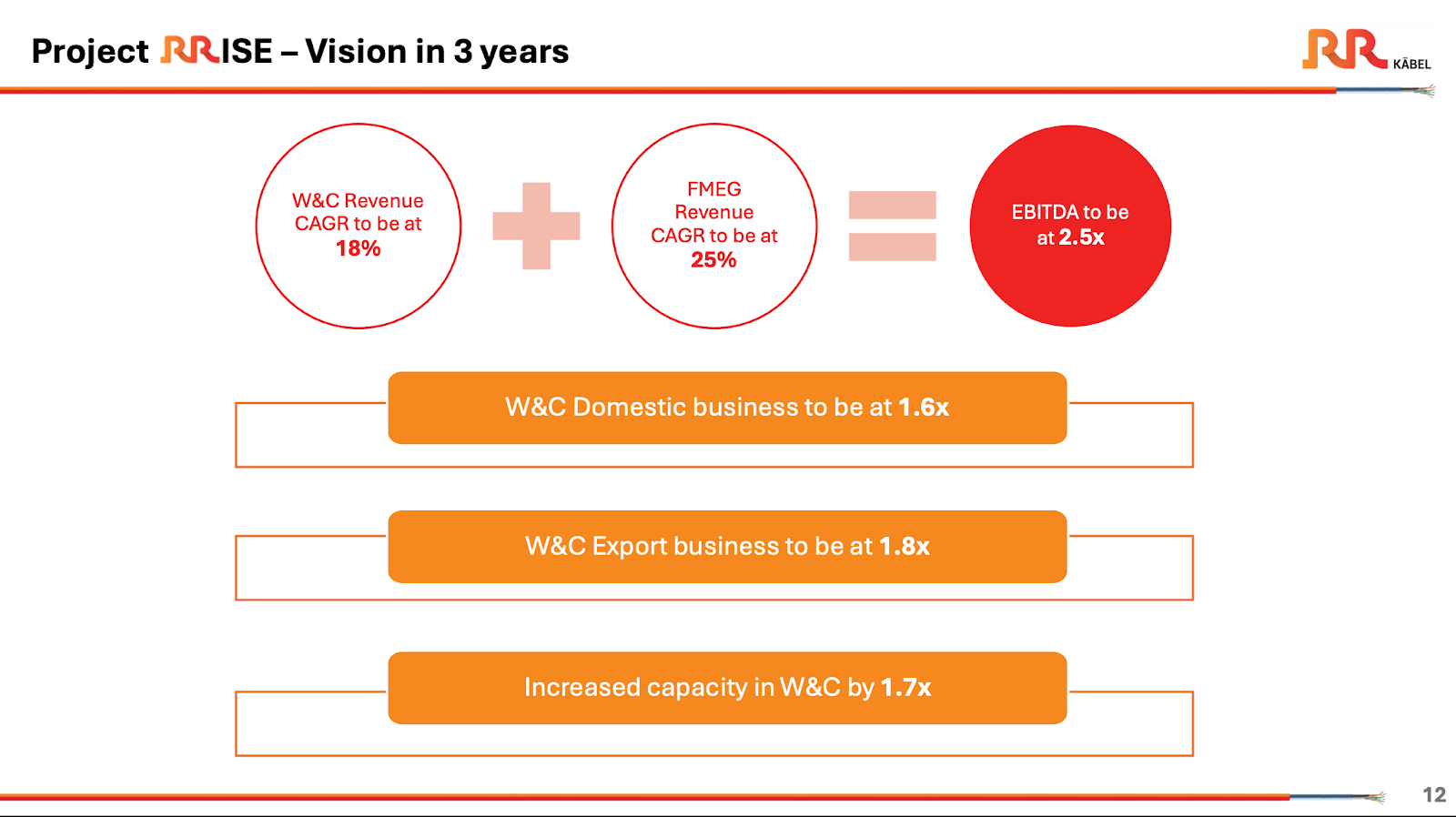 Under its 'Project Rise' strategic vision for the next three years, RR Kabel aims for an 18% W&C Revenue CAGR. This is expected to be largely driven by faster growth in the cable segment, where the company is currently under-indexed relative to the industry mix (RR Kabel is ~70% wire, 30% cable vs industry ~35% wire, 65% cable).