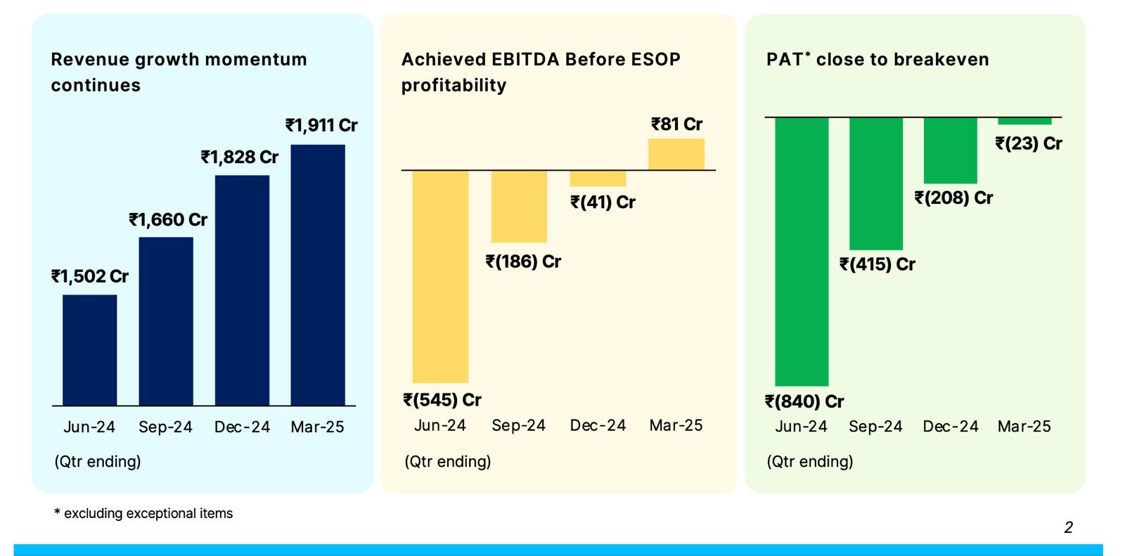 After a turbulent FY24, marked by regulatory action against Paytm Payments Bank and sharp contraction in business operations, Q4 FY25 showcased early signs of a turnaround. While revenues dropped 3% QoQ to ₹2,267 Cr, the company made significant progress in realigning its business model.