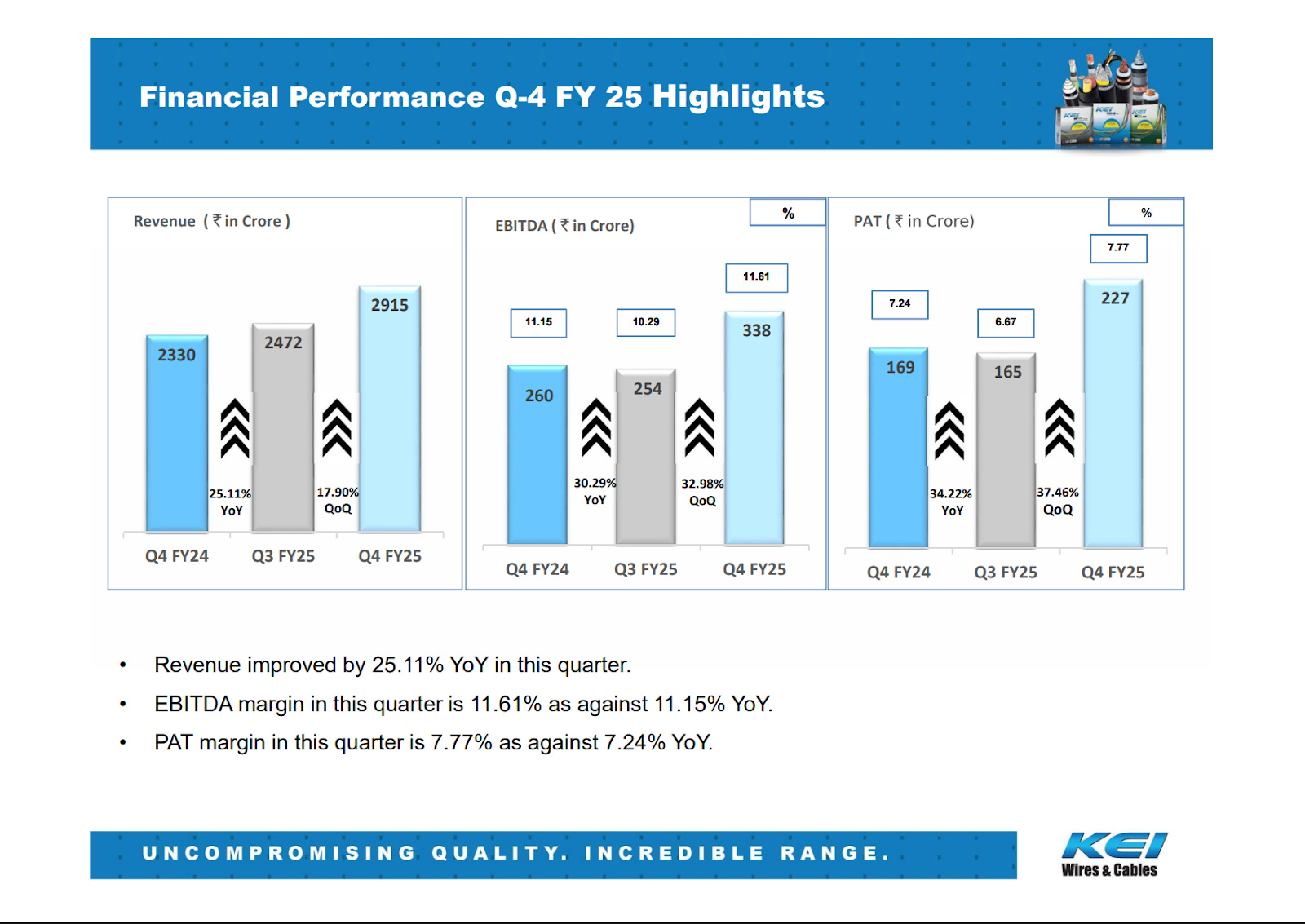 During Q4FY25, the segment recorded solid growth, supported by continued demand across key sectors. Factors such as higher government spending, improved execution of infrastructure projects, firm real estate activity, and rising commodity prices contributed to this performance. The domestic business grew 27% YoY, with cables once again growing faster than wires. Both the channel and institutional segments showed steady momentum.