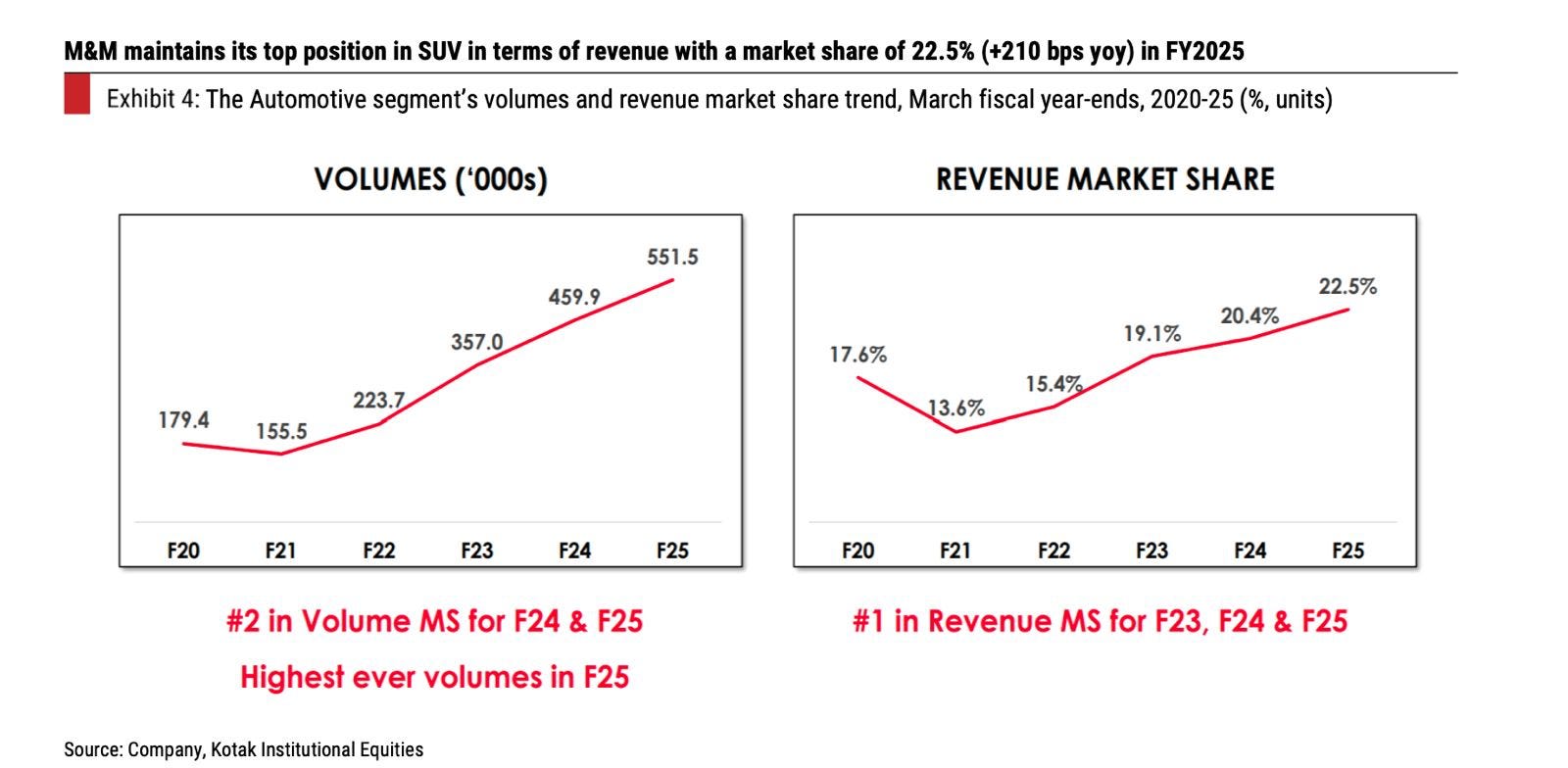 M&M strengthened its SUV revenue market share by 210 bps year-over-year in Q4FY25, securing the top spot. This growth was fueled by new models like the XUV 9e and BE6, along with price adjustments for certain XUV 700 versions. In the <3.5T LCV category, the company's market share increased by 290 bps year-over-year to 51.9% in the same period. M\&M also continued to lead the EV 3W segment, achieving a 42.9% market share in Q4FY25, a 110 bps quarter-over-quarter improvement. The company introduced four new EV 3W products last quarter: Treo Metal, Zeo, eAlfa Plus, and Alfa Duo.