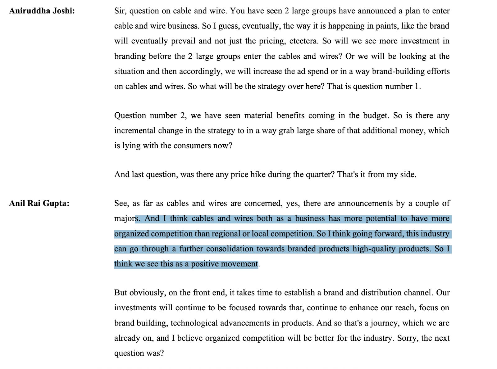 Competition and Formalisation: The industry is seeing increased participation from new entrants, including announcements by a couple of large groups. Companies like Havells and RR Kabel view this as a positive development that could lead to further formalisation of the sector, consolidating towards branded and high-quality products. While increasing competition is a factor, companies rely on quality, brand loyalty, consumer pull, distribution channels, and pricing as key differentiators. Establishing presence in segments like industrial cables requires long-term effort and approvals, acting as a barrier to entry.