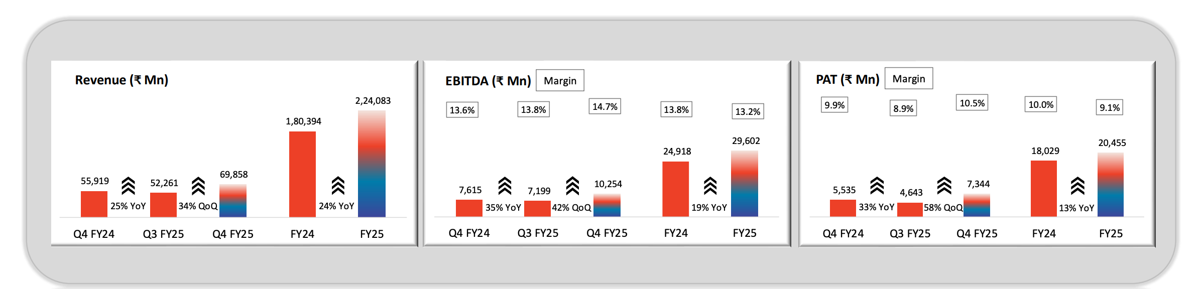 Net profit (PAT) grew by 33% YoY and 58% compared to the previous quarter, with margins increasing to 10.5%. Q4 PAT crossed ₹700 crore for the first time, contributing to a full-year PAT of over ₹2,000 crore.